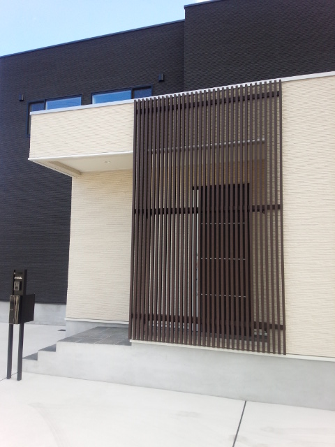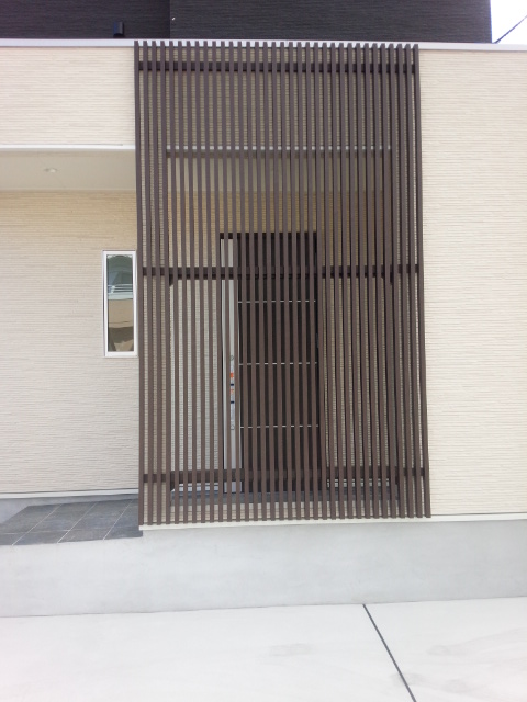 アルミ格子が印象的なすっきりとした素敵なエントランスになりました。家のファザードを彩りながら、周囲の視線を遮ることでプライバシーを保ちつつ格子のスリットから光や風を採りこみます。自然な風合いはモダン住宅はもちろん和風のすまいにもしっかりと調和して外観デザインをひきたてます。