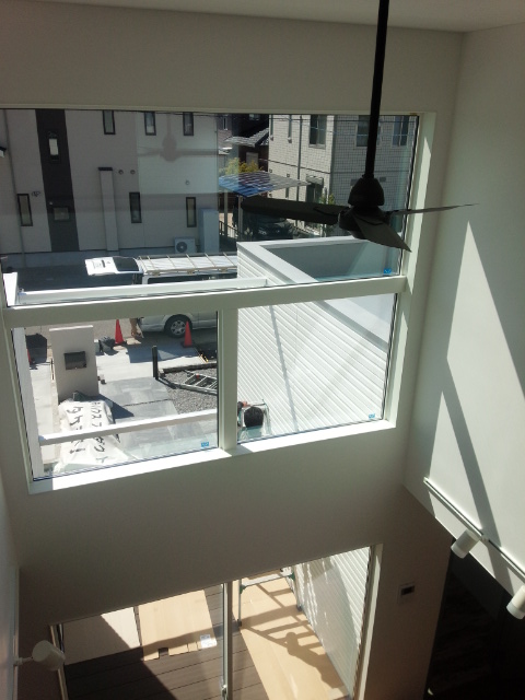 吹き抜けの上につけた窓です。一枚窓でなく組み合わせになった素敵なデザインです。大きな窓から光をいっぱいに取り込んで明るい玄関に仕上がってますね。