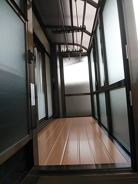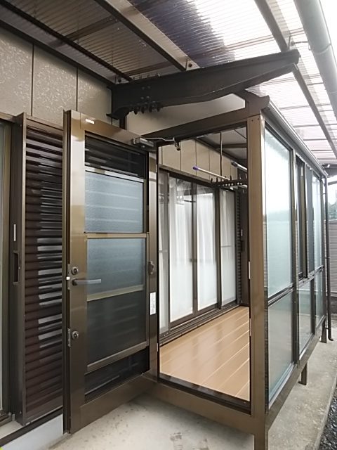 掃出し窓の前にテラス囲いをつけさせて頂きました。これからの梅雨の季節、お洗濯の強い味方になりそうです。また外からの視線を気にしないでちょっとした憩いの場にもなりそうな素敵な空間ですね。
