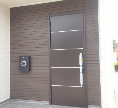 こちらは玄関横に丸窓ををつけその上に木目タイプのアルミ格子を取付けモダンになり過ぎない優し…