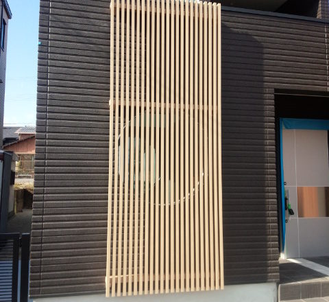 こちらは玄関横に丸窓ををつけその上に木目タイプのアルミ格子を取付けモダンになり過ぎない優し…